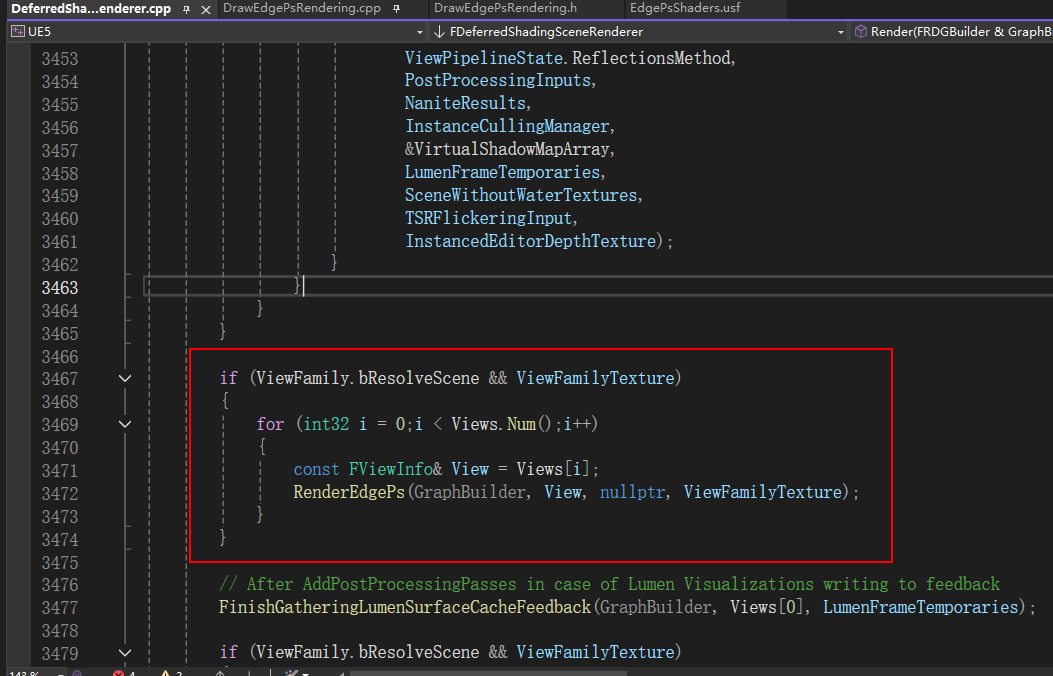 AddDrawScreenPass(GraphBuilder, RDG_EVENT_NAME("Edge Pass"), View, FScreenPassTextureViewport(ViewFamilyTexture), FScreenPassTextureViewport(ViewFamilyTexture), PixelShader, PassParameters); }